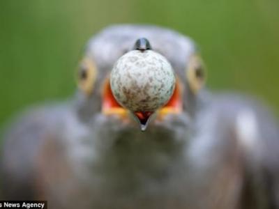 一只布谷鸟正在偷取其他鸟类的蛋,从图中可看出它惊恐的眼神,它用嘴叼着一枚鸟蛋...