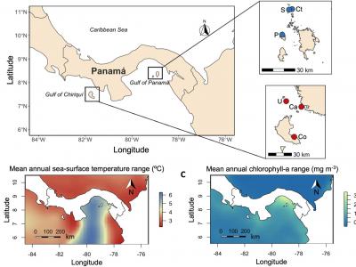 (A) 太平洋巴拿马地图;(B) 海面温度值的平均年范围(2000–2014年的平均值,单...
