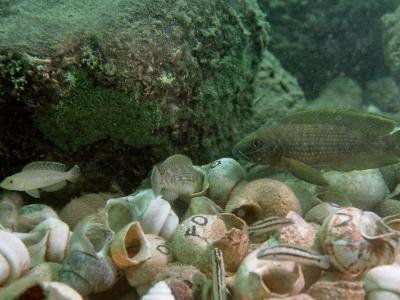 一窝空蜗牛壳与巨型领地巢主人(右),一只刚刚进入壳内的雌性(中)和一只寄生的侏儒雄...