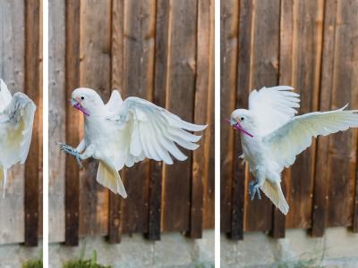 这是一系列照片,展示了一只叫Figaro the Goffin的凤头鹦鹉带着一套两个工具飞向一...
