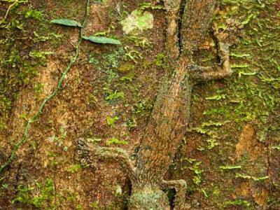 在马达加斯加岛东北部的马索亚拉半岛国家公园,一只叶尾壁虎趴在长满青苔的树干上...