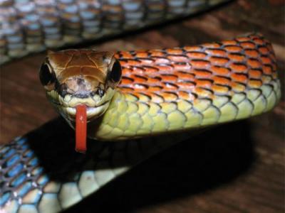 火焰蛇(柯普斯坦氏过树蛇)体长约1.5米,其颈部是鲜艳的橙色,并伴有彩虹色、蓝色...