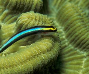 虾虎鱼Elacatinus evelynae 新的发现表明,通过在珊瑚礁附近盘旋的五彩缤纷的鱼...