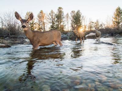 騾鹿跨越怀俄明州的一条河。愈来愈多种动物可感染SARS-CoV-2,騾鹿是其中之一。PHO...