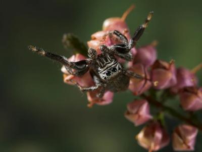 图片中是一只在花朵上的弓拱猎蛛(Evarcha arcuata)。这些蛛形纲动物似乎能作场带...