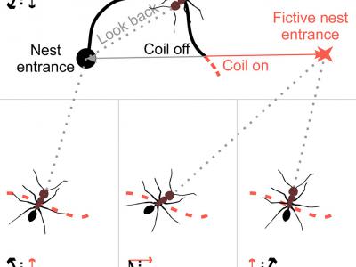 沙漠蚂蚁可以感知磁场的南北方向,从而在所谓的学习行走中确定巢穴入口的方向。图片...