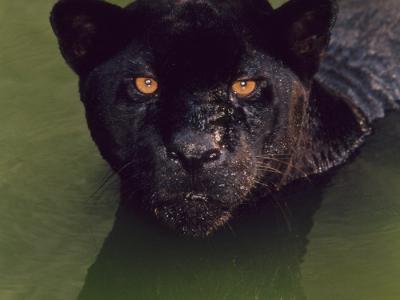 一只黑色美洲豹在巴西游泳。 「黑豹」(black panther)这个专有名词是一个概括性术...