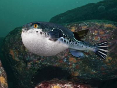 一只网斑河豚(Takifugu poecilonotus)鼓胀身体,作为一种防御手段。 这些鱼被称为...