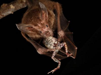 在巴拿马的巴洛科罗拉多岛上,一只粗面蝠大啖一只南美泡蟾。 PHOTOGRAPH BY CHRIST...