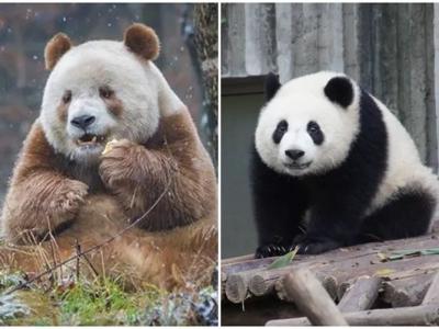 秦岭棕色大熊猫“七仔”(左图)与四川大熊猫(右图)。(神秘的地球uux.cn报道)今...