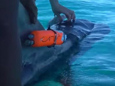 研究员把特殊标签固定于虎鲨的背鳍上。影片显示虎鲨没有试图追...