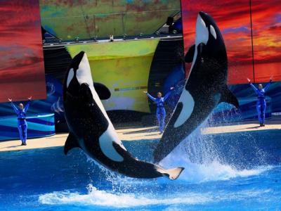 2014年,虎鲸在圣地亚哥海洋世界表演。 这些哺乳动物非常聪明...