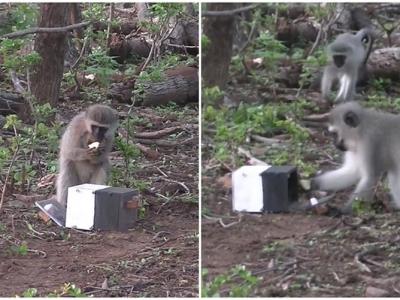 研究人员让雌性(左图)及雄性(右图)黑长尾猴分别打开白色及...