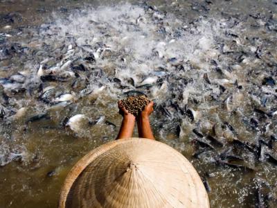 在越南龙川市 (Long Xuyen)一家鲶鱼养殖场的喂食时间,数千...