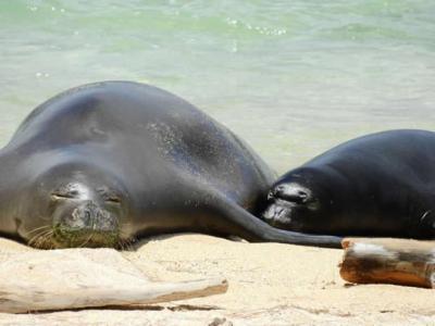 2017年,夏威夷僧海豹RT10和她的第三只幼海豹躺在欧胡岛的北部...
