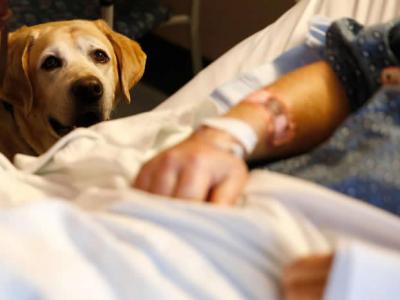 一只名叫塔克(Tucker)的治疗犬在2018年3月6日于波士顿麻省总医院(Massachusetts...