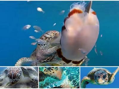 科学家发现海龟懂得出“手刀”,下图左起为绿蠵龟、玳瑁和赤蠵...