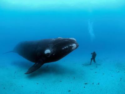 一头南露脊鲸在新西兰奥克兰群岛外接近一名潜水员。 PHOTOGRA...