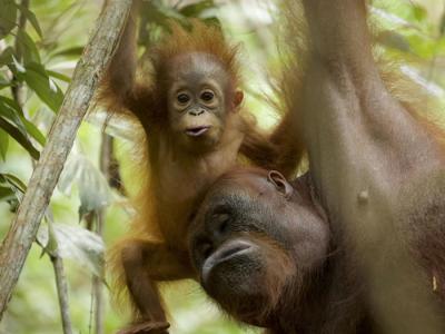 婆罗洲野生猩猩母亲和其11个月大的婴儿。对其它猩猩...