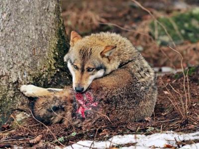 德国巴伐利亚森林中,一只因争地盘战斗而受伤的灰狼...