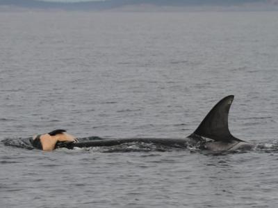 虎鲸妈妈驮着夭折的新生儿。许多鲸类会做出哀悼之举。 / PHOTOGRAPH BY ROBIN W....