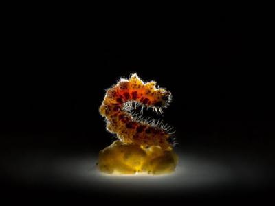 一只纹白蝶(cabbage butterfly)幼虫僵在菜蝶绒茧蜂(Cotesia glomerata, white bu...