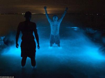 游泳者进入湖泊后全身形成荧光色,看上去好像涂了放射性涂料 这是一种叫做“生...