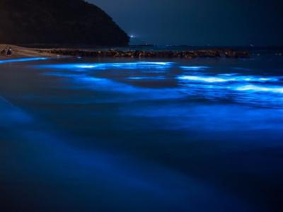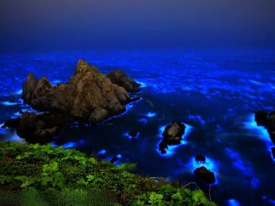 日本鸟取县夜光虫繁殖让海岸现蓝光美景