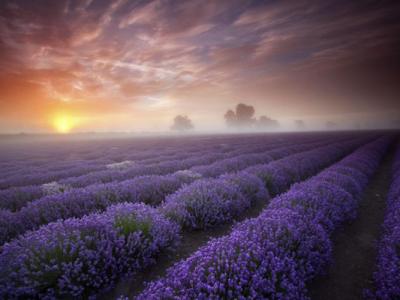 晨光下的萨默塞特郡福克兰的薰衣草种植园 清晨的迷雾笼罩大地,薰衣草似乎消失...
