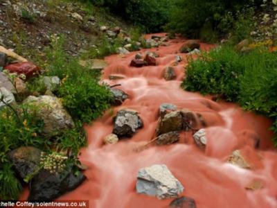 这一自然现象是罗谢尔·科菲在加拿大艾伯塔卡梅伦瀑布拍摄的。水的红色是暴雨将红...