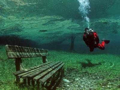 一名潜水员打算在绿湖下的长椅上休息一下 图片显示的是秋、冬两季这座公园的景...