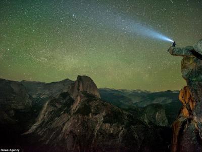 一名观星者坐在加州约塞米蒂国家公园的著名景点“冰川点”边缘处,头戴照明灯观赏...