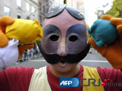 来自意大利剧木偶奇遇记的剧成员在纽约曼哈顿第五大道进行街头表演。图片来源:(...