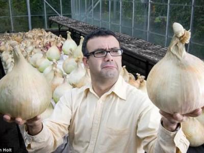 文森特正在检查两头非常大的洋葱 目前,英国兴趣一股培植巨型蔬菜的热潮。约...