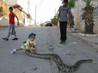 巴勒斯坦2岁幼童骑巨蟒玩耍