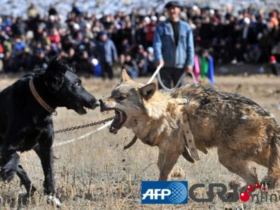在狩猎节上,一只铁链拴着的狼正在向一条猎狗发动攻击,巴肯巴耶沃村距离吉尔吉斯...