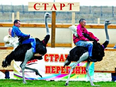 乌克兰首都基辅一家农场举办骑鸵鸟赛跑