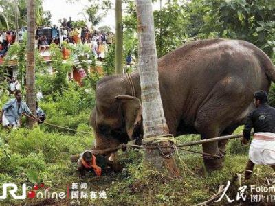 2010年9月25日,印度,Tiruvilvamala:驯象员在逃避大象的攻击时摔倒,众人在旁围...