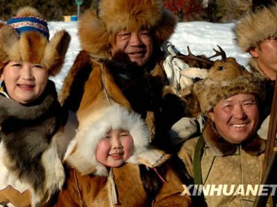 鄂伦春族猎民身穿皮衣,头戴皮帽,脚踏皮靴,参加迎春仪式表演活动(2010年2月6日...