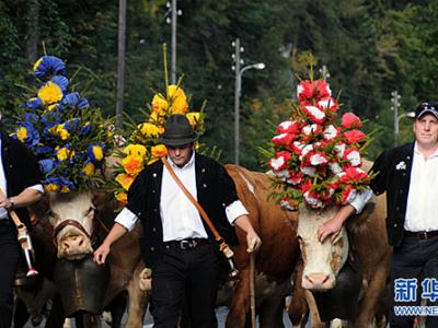10月2日,在瑞士瓦莱州山间小镇莱蒂瓦, 当地居民赶着自家的牛群下山。每...