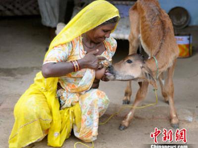 印度妇女为自家牛犊哺乳 据路透社报道,印度一名47岁的妇女每天给自家的牛犊哺乳...