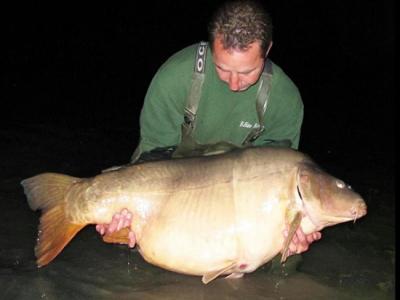 安布鲁斯·史密斯在法国钓鱼时钓到一条99磅(约44.91公斤)重的巨大鲤鱼,打破了世...