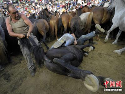当地时间7月3日,西班牙萨武塞多,年轻人在传统的“捕野马节”上驯服野马。...