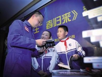 昨日,北京航天城,模拟登陆“火星”志愿者王跃与孩子们交流。 模拟登陆“火星”...