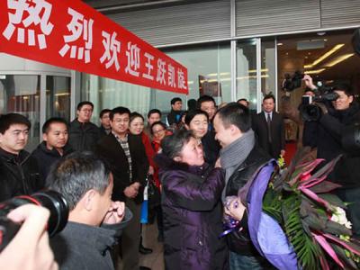 在首都国际机场,王跃与阔别已久的父母热烈拥抱。 王跃所在单位中国航天员中心...