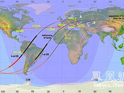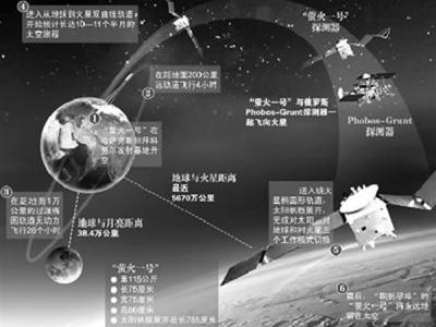 “萤火一号”征程示意图 北京时间昨天(11月9日)凌晨4点16分,中国首颗火星探测...