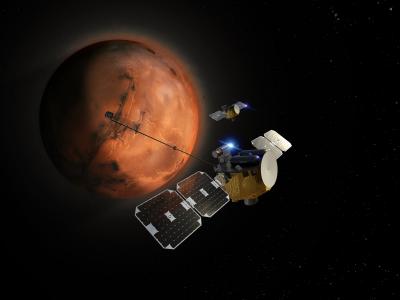 插图:ESCAPADE航天器在围绕火星的轨道。Credits: Credits: Rocket Lab USA/UC Ber...
