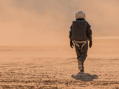 一个穿着棕色宇航服的人在红橙色的沙漠上行走(图片来源:uux.cn/Nisian Hughes/Ge...