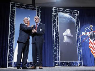 彭斯(左)到访詹森太空中心。彭斯(中)与受训的太空人交谈。...