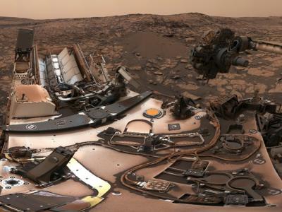 好奇号车身覆盖上一层薄薄的灰尘。火星天空一片暗黄色。(神秘...